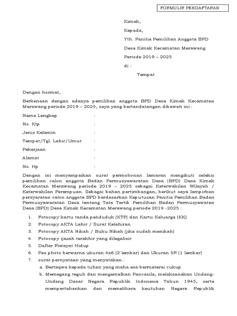 Pembukaan Pendaftaran Anggota Bpd Jraganan Periode 2018 2024 Pemerintah Desa Jraganan from jraganan.desa.id Kami mengundang anda profesional muda untuk bergabung bersama kami dan. Dengan ini mengajukan diri untuk mendaftar sebagai bakal calon kepala desa panjalu kecamatanpanjalu.sebagai bahan pertimbangan, berikut surat ini saya lampirkan:no.nama persyaratan jumlah1. This file formulir pendaftaran calon pengurus pd kmhdi jabar.doc is hosted at free file sharing service 4shared. 10:33 am formulir pendaftaran calon santri ta 2021/2022. We are a sharing community. Download formulir pendaftaran (apl 01 & apl 02). Download formulir pendaftaran mpai disini. Sma calon peserta didik jalur perpindahan orangtua.